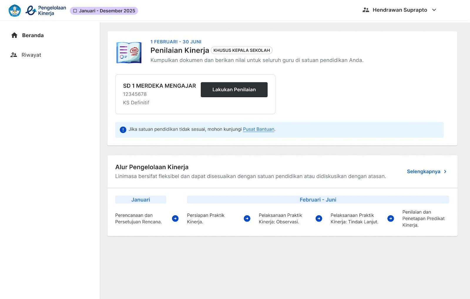 1. Pada halaman Pengelolaan Kinerja Kepala Sekolah (PKKS), klik menu Kepala Sekolah lalu pilih Sebagai Pejabat Penilai Kinerja, kemudian klik ‘Lakukan Penilaian’ untuk masuk ke halaman Penilaian Kinerja.