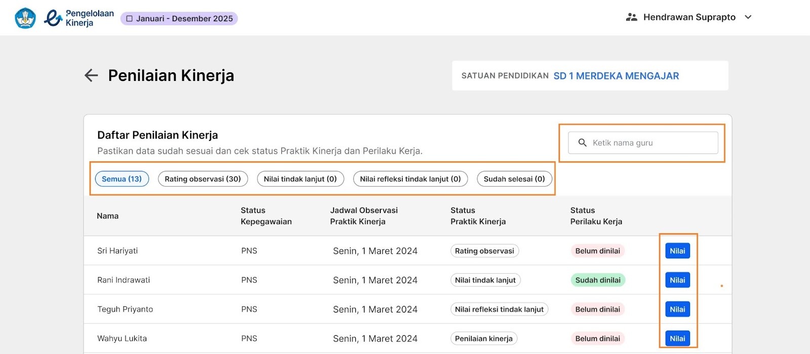 3. Pada halaman Penilaian Kinerja, Kepala Sekolah dapat memilih Guru yang akan diberikan Penilaian Perilaku Kerja berdasarkan observasi yang sudah dilakukan. Beberapa cara untuk menemukan Guru yang ingin dinilai: