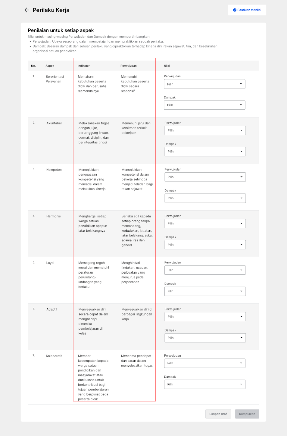- .Perhatikan Indikator dan Perwujudan dari Aspek Perilaku Kerja yang dipilih oleh Guru untuk diprioritaskan.