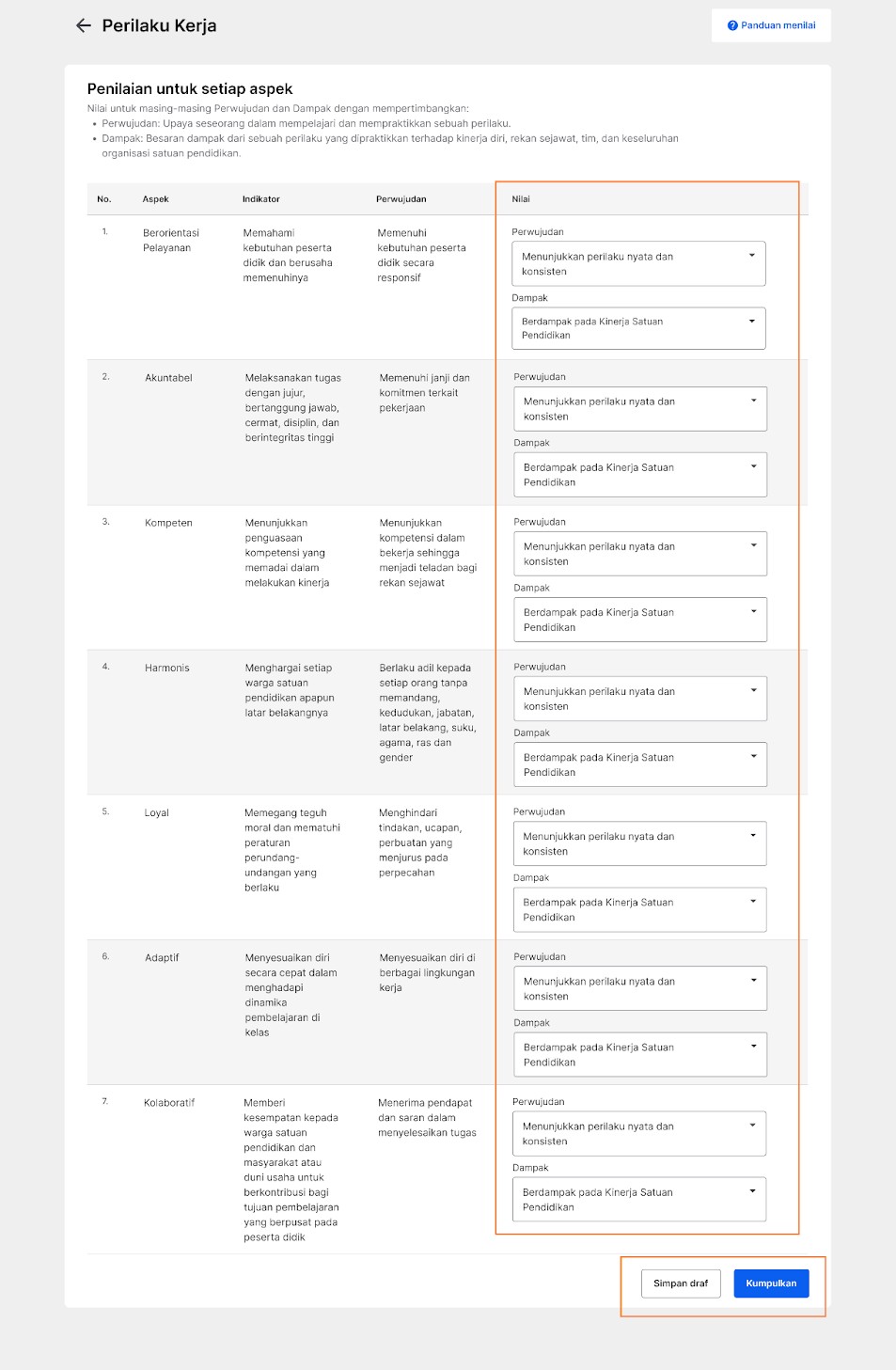 6. Klik ‘Kumpulkan’ jika Anda sudah memberikan Penilaian Perilaku Kerja atau klik ‘Simpan Draf’ jika Anda ingin berhenti sejenak dan melanjutkan pengisian di lain waktu.