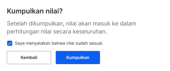 7. Setelah itu, akan muncul tampilan konfirmasi untuk memastikan Nilai Perilaku Kerja dapat dikumpulkan. Jika nilai yang diberikan sudah sesuai, pilih Ceklis dan klik ‘Kumpulkan’, namun jika Anda ingin melakukan pengecekan ulang atau perubahan, klik ‘Kembali’.